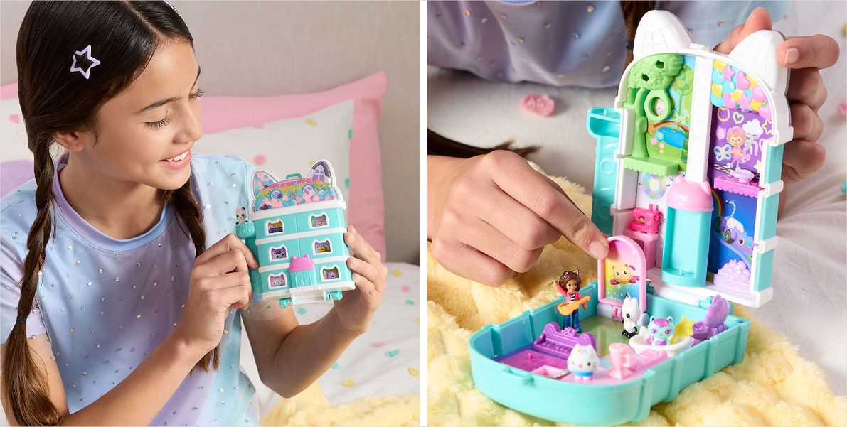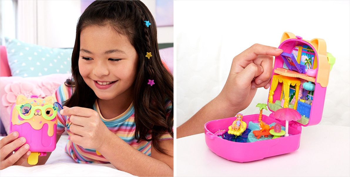 Polly Pocket w zestawie z miłośniczką kotów? To możliwe z kompaktowym zestawem "Koci domek Gabi" w kształcie domku z brokatową dekoracją na dachu. Wewnątrz znajdują się ruchome elementy, m.in. kocia winda, opuszczany baner w sali imprezowej, a także toaletka i łóżko, które skrywają niespodziankę. Do zestawu dołączone są mikrolalka Gabi i jej trzy kotki: Kiciuś Panduś, Łakotek i Syrenkotka.