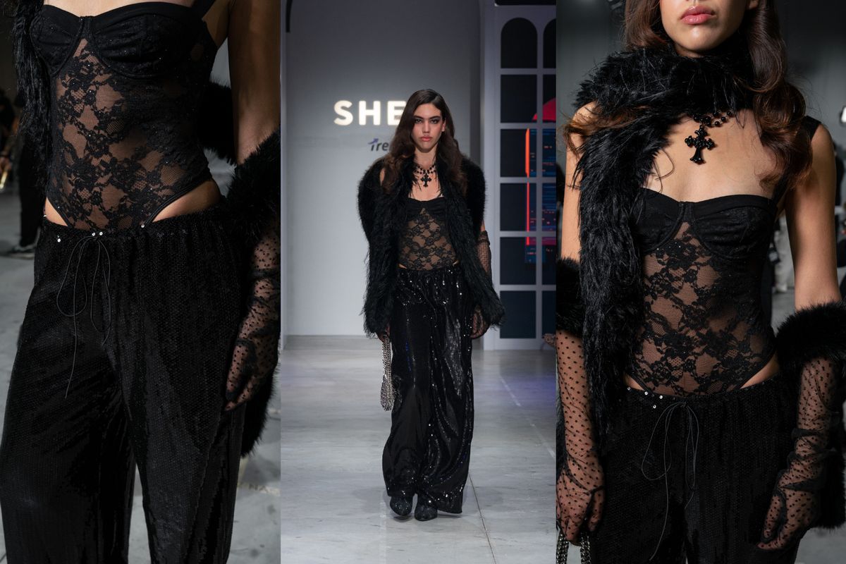 Oficjalne, miejskie i biurowe stylizacje to jednak nie wszystko! Na pokazie SHEIN znaleźliśmy również zjawiskową inspirację od marki Mausera na imprezowy outfit: szalenie kobiecy, a jednocześnie nowoczesny. Cekinowe, szerokie spodnie zestawiono z półprzezroczystym koronkowym body, tworzącym na skórze efekt zmysłowego tatuażu, oraz z futrzanym szalem. Również i w tym przypadku całość wieńczą dodatki: siatkowe rękawiczki i wyrazista biżuteria w gotyckim stylu. To idealna propozycja dla kobiet, które nie boją się ekstrawaganckich zestawów i chcą wyróżnić się z tłumu.